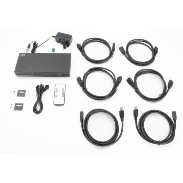 De AC7914 heeft vier USB 3.2 Gen1 (USB 3.0) 5Gbps poorten voor het delen van randapparatuur zoals een toetsenbord, muis, printer en meer. De switch heeft ook een 3,5mm audio-aansluiting voor het aansluiten van een koptelefoon of luidsprekers. HDMI-kabels, USB-kabels, afstandsbediening, RS-232-connector en montagemateriaal zijn inbegrepen.