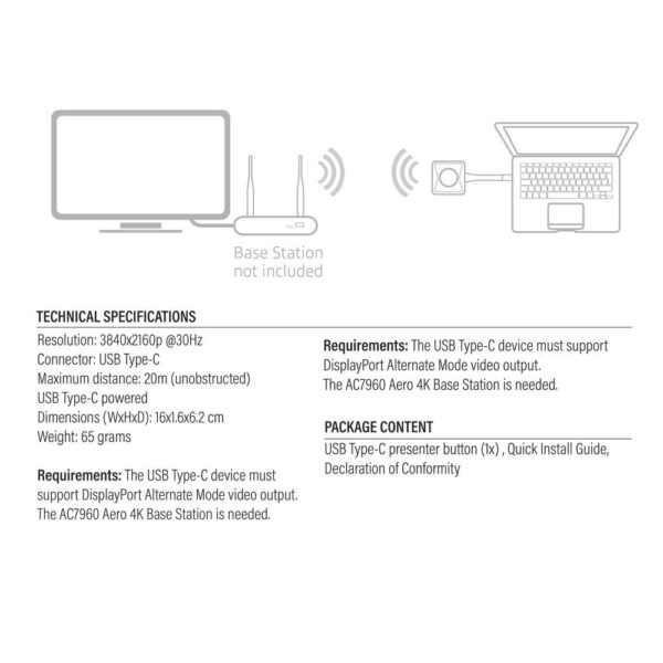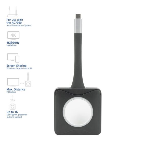 De AC7961 Aero 4K presentator knop is een extra button voor het gebruik met het AC7960 Aero 4K Draadloos Presentatiesysteem. Het systeem ondersteunt 16 presenter buttons waardoor je met meerdere gebruikers content kunt delen. De maximale afstand tussen het basisstation en de knop is 20 meter. De presentator knop wordt gevoed via USB Type-C® en koppel je gemakkelijk met het basisstation.