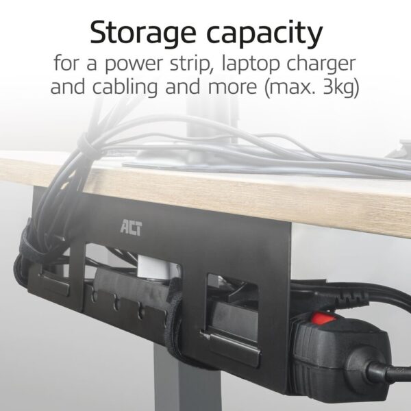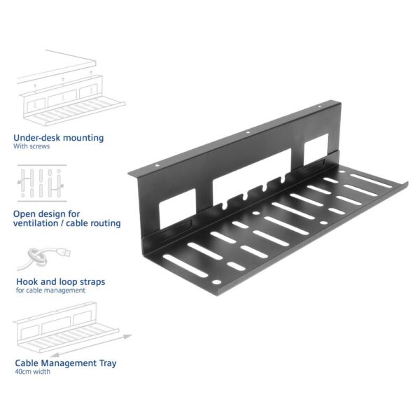 De metalen AC8380 kabelgoot zorgt voor het netjes en opgeruimd houden van een bureau en voor het ordenen van kabels. De kabelgoot heeft een breedte van 40cm en biedt genoeg ruimte voor het opbergen van een stekkerdoos, laptoplader, kabels en meer. De kabelgoot heeft een open structuur voor betere ventilatie en kabelgeleiding. De AC8380 wordt geleverd met klittenband voor kabelmanagement en schroeven om de goot onder een bureau te bevestigen.