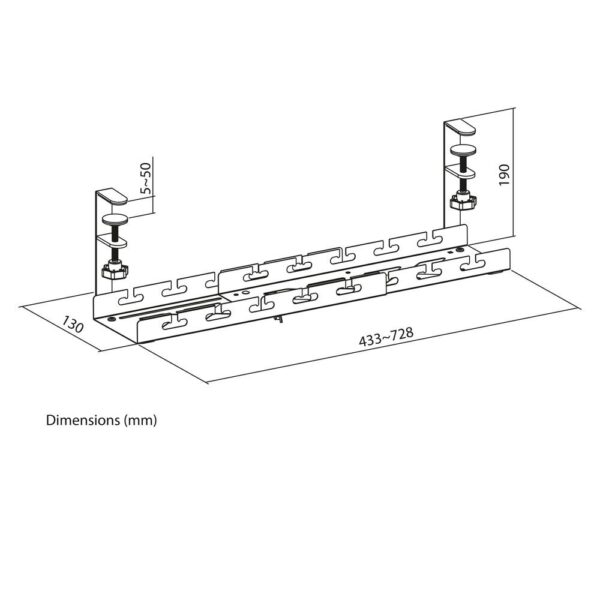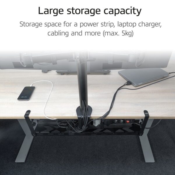 De metalen AC8379 kabelgoot zorgt voor het netjes en opgeruimd houden van een bureau en voor het ordenen van kabels. De kabelgoot is eenvoudig verstelbaar en aan te passen aan de gewenste breedte: 43 – 72 cm. Hierdoor is de AC8379 geschikt voor verschillende maten bureaus en biedt genoeg ruimte voor het opbergen van een stekkerdoos, laptoplader, kabels en meer. De kabelgoot heeft een open structuur voor betere ventilatie en kabelgeleidingen en is te monteren zonder te schroeven of het boren van gaten. Bevestig de goot onder een bureau (maximale tafeldikte 50mm) met het bijgeleverde klemsysteem. De AC8379 kan samen worden gebruikt met een monitorarm met klemmontage.