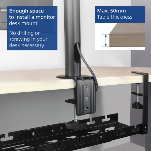 We kunnen het ons voorstellen dat het je tegen staat om in een bureau te gaan boren. Daarom leveren wij een klemsysteem mee voor het monteren van de kabelmanagementgoot. Met de meegeleverde klem installeer je eenvoudig de goot onder een bureau met een maximale bladdikte van 50mm.