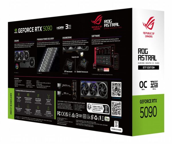 De ASUS ROG Astral GeForce RTX 5090 O32G BTF Gaming combineert extreme grafische kracht, geavanceerde AI functionaliteit, robuuste koeling en hoogwaardige bouwkwaliteit in één premium videokaart. Met 32 GB GDDR7 VRAM, ondersteuning voor de nieuwste NVIDIA technologieën en uitgebreide connectiviteit is deze GPU klaar voor ultra instellingen in moderne AAA games, zware productieworkflows en toekomstbestendige 4K en 8K toepassingen.