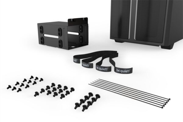 Het PSU-scherm bedekt de kabels en de PSU perfect. Het bevat ook een dubbele HDD-kooi met ontkoppelde bevestigingen die trillingen verminderen en helpen het geluid te maximaliseren. De kooi kan ook worden verplaatst om een radiator van maximaal 360 mm aan de voorkant te installeren. De voedingseenheid kan eenvoudig van achteren worden geïnstalleerd, gemonteerd op de PSU-beugel die wordt geleverd.