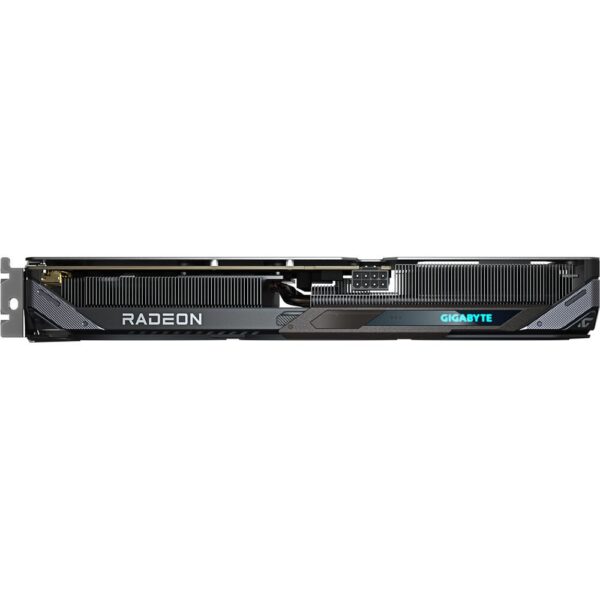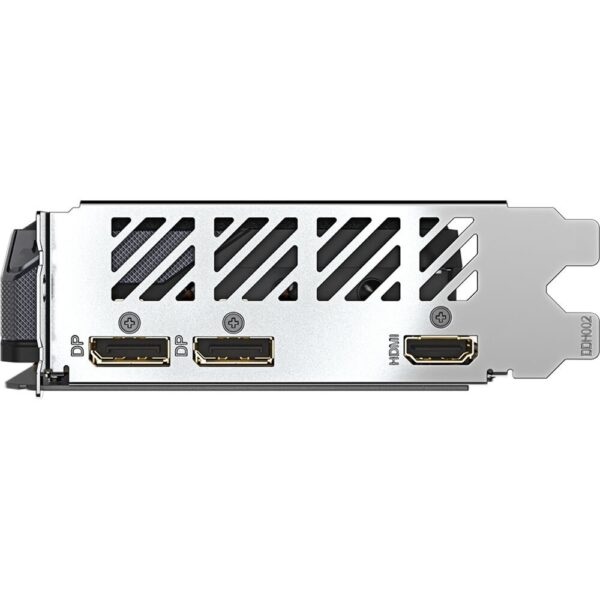 De koeling wordt verzorgd door het betrouwbare Windforce 3X-koelsysteem, bestaande uit drie aerodynamische ventilatoren, een koperen basisplaat en samengestelde heatpipes die warmte efficiënt afvoeren van de GPU en het geheugen. De 3D Active Fan-technologie zorgt ervoor dat de ventilatoren bij lichte belasting volledig stil blijven, terwijl de Graphene nano-smering de levensduur van de lagers verlengt. De stevige metalen backplate biedt extra stijfheid en geeft de kaart een premium uitstraling, met subtiele RGB-verlichting die naar wens aan te passen is via GIGABYTE Control Center.